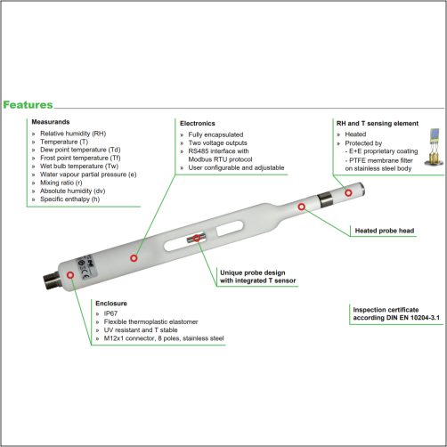 Medición exacta de humedad y temperatura incluso con alta humedad permanente. El sistema de calentamiento dual evita la condensación y garantiza un tiempo de respuesta corto y una recuperación rápida después de las condiciones de condensación.
